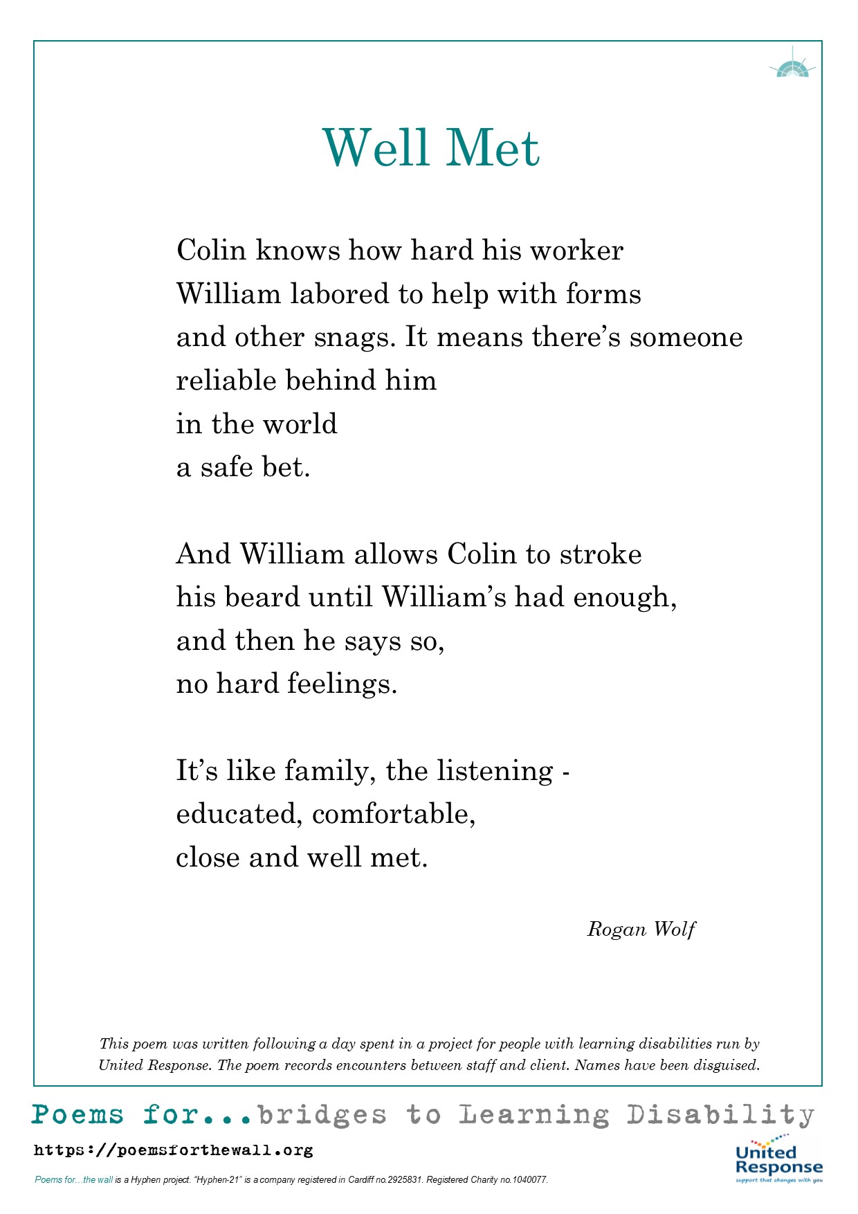 “Since our clients have learning disabilities, for some the written word is not accessible. However, some clients have been very taken with the poems, selecting their favourites and saying how good they are.”