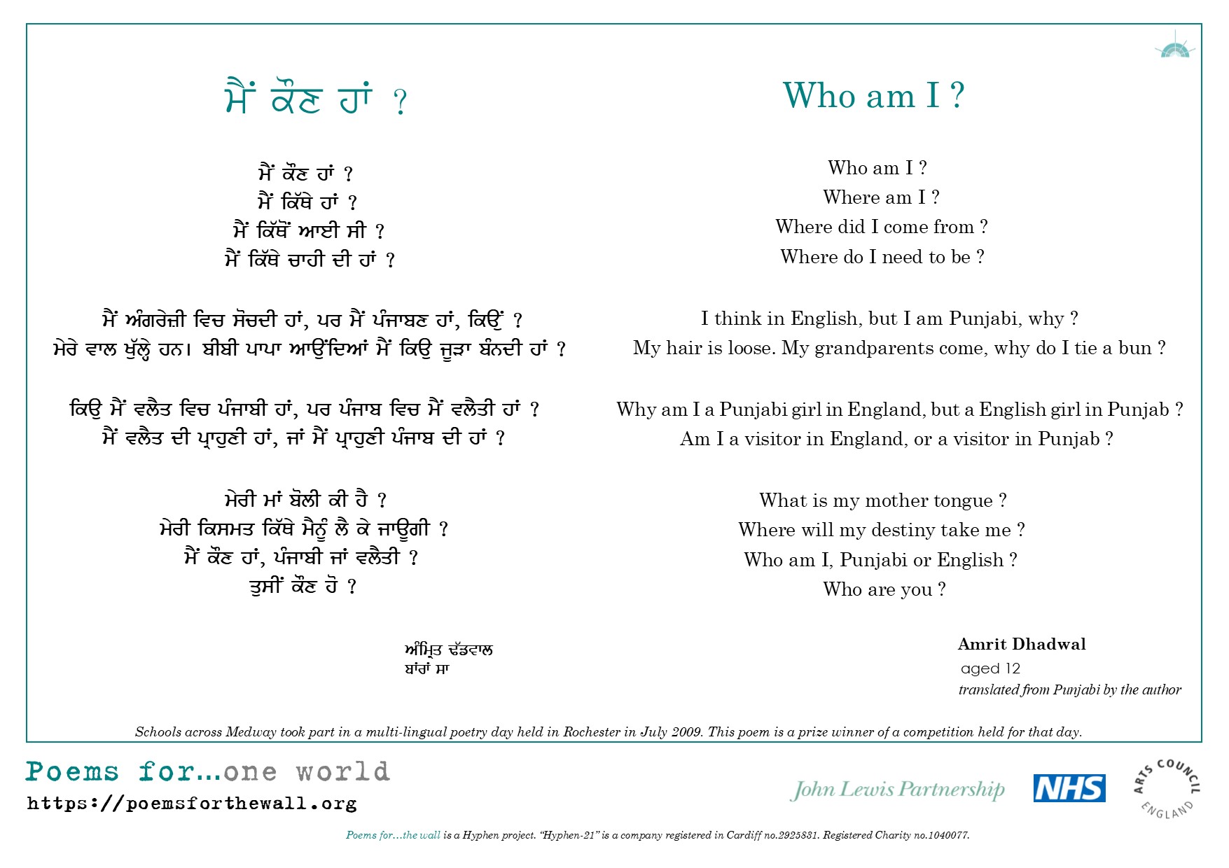 “I think that this is a stimulating, exciting and important project… Many, many thanks … I am excited and delighted that my poem is appearing in several languages [here]. It shows that we can talk to each other just as we try to care for each other… I think the project needs all the help it can find.”