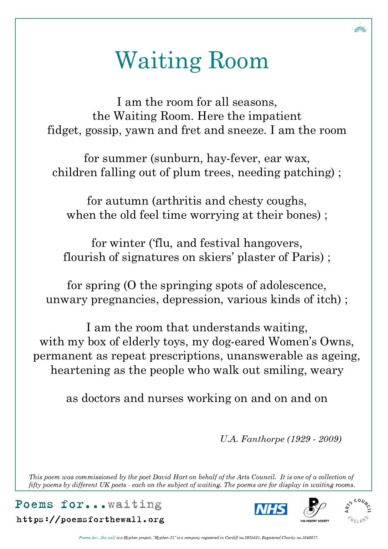 “The poems are… being changed around regularly, and patients often comment on them in passing….Thank you again for the initiative, and please keep us informed of any new schemes, or if there is a way we can encourage other organisations to benefit from this great idea.”